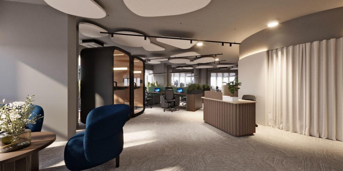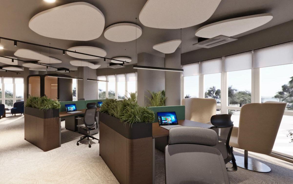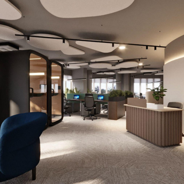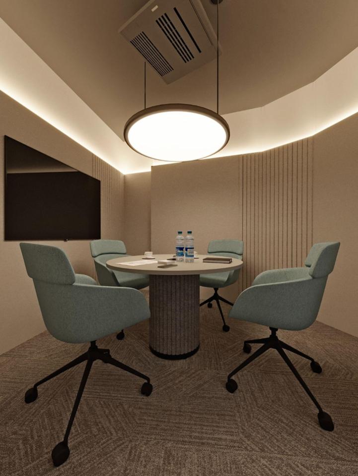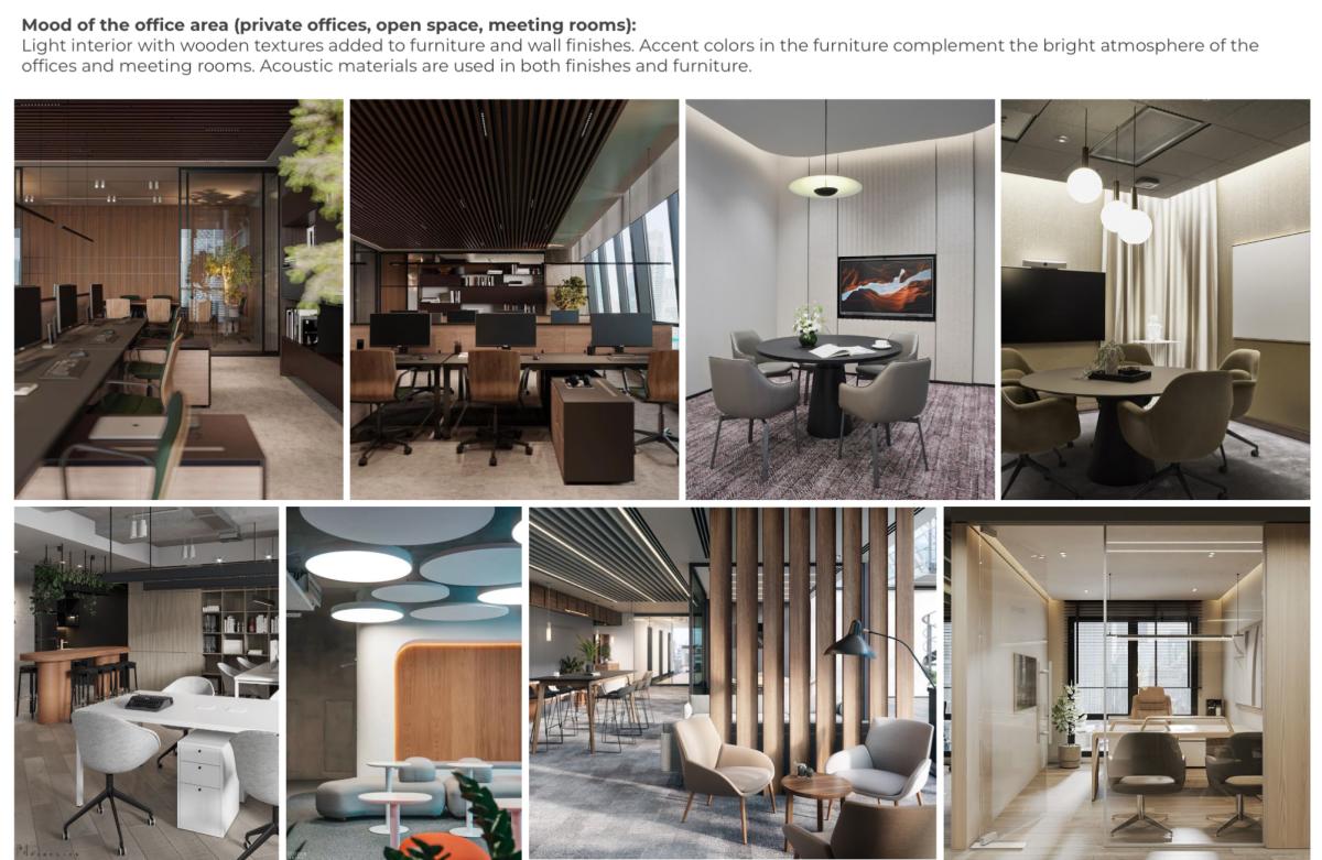 Workspaces and meeting rooms are designed in a calm palette with wooden textures and acoustic materials to create a comfortable environment.