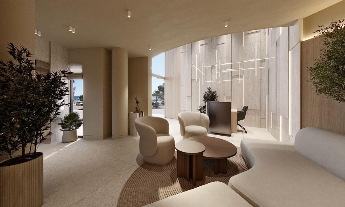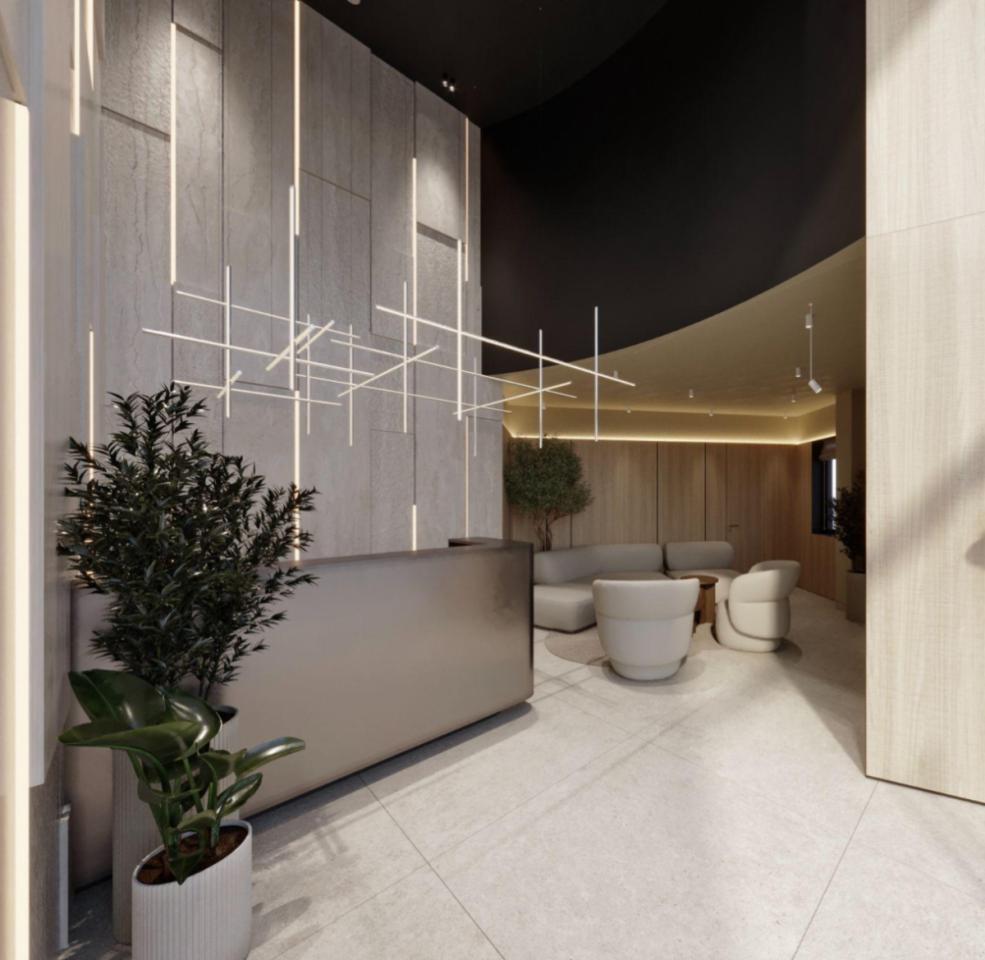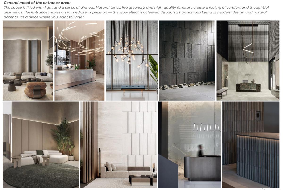 The entrance area features a light and airy aesthetic with natural tones, modern furniture, and botanical accents.