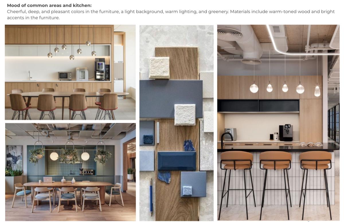 The common areas and kitchen are executed in a more dynamic style, with warm lighting, wooden finishes, and deep accent tones in the furniture.