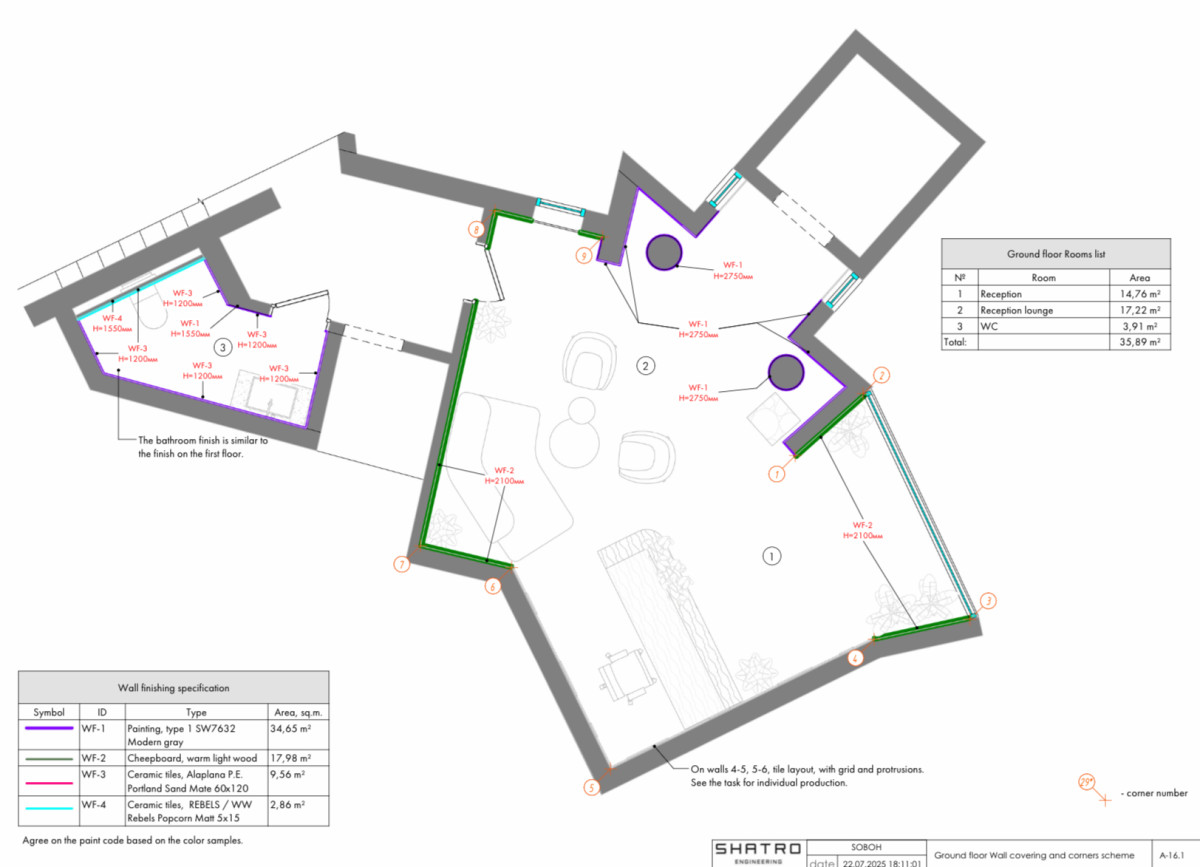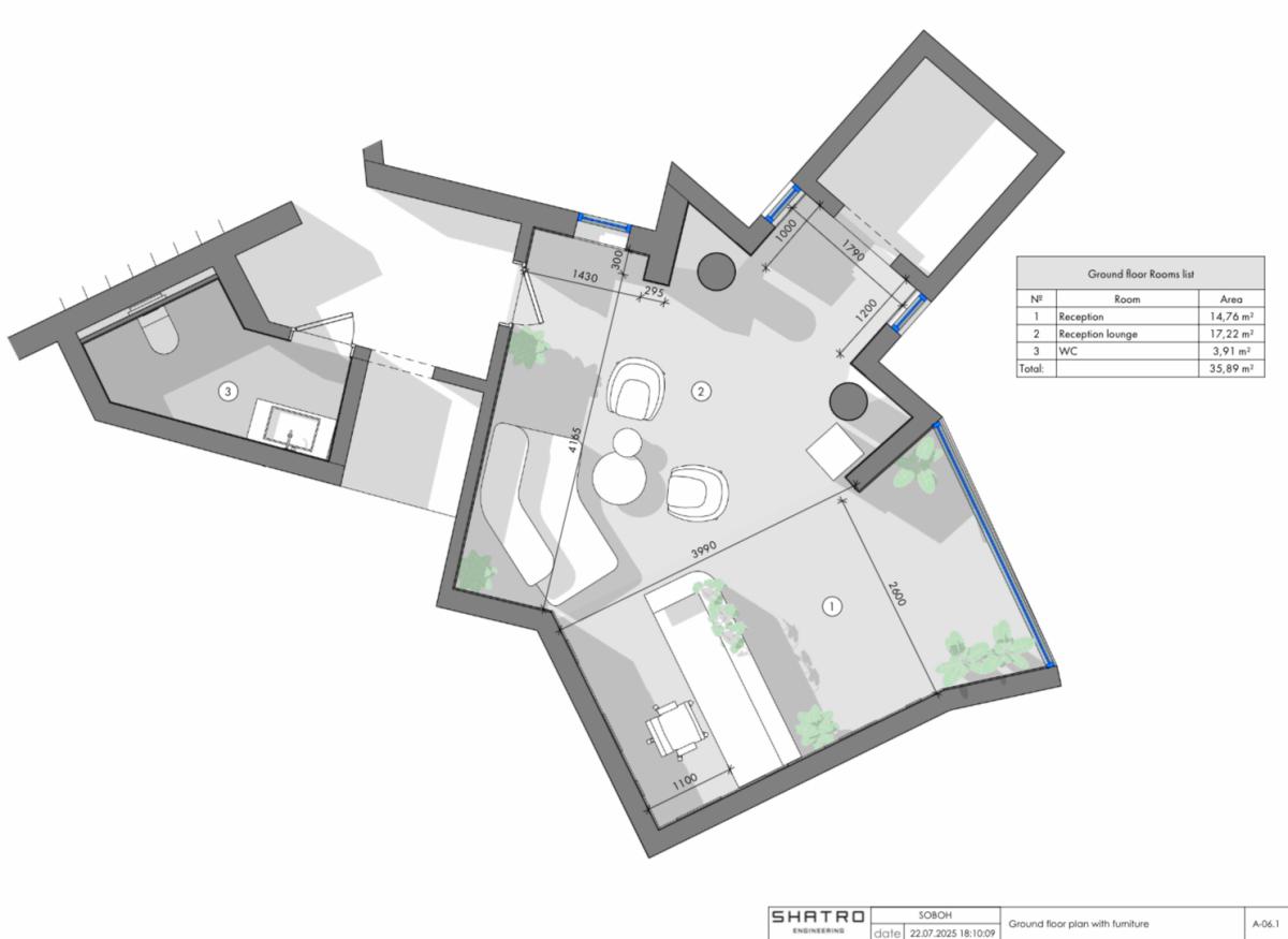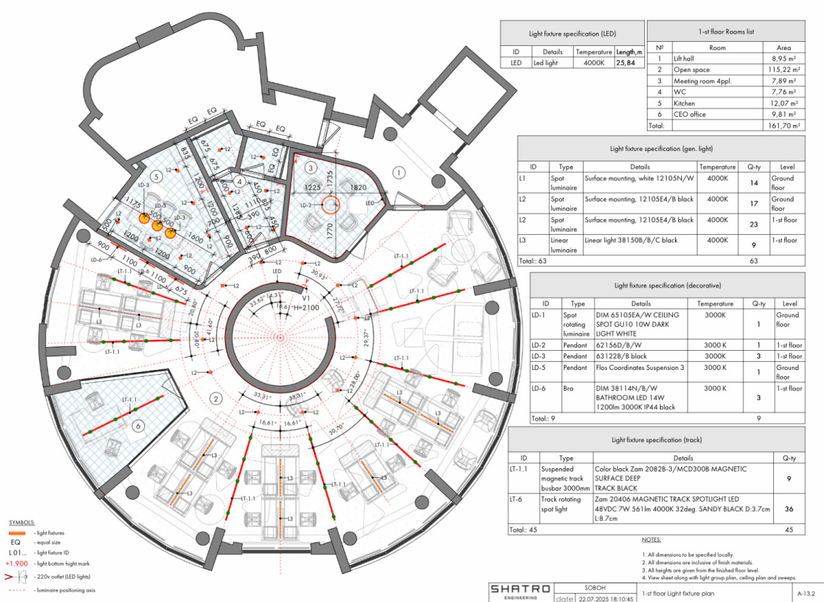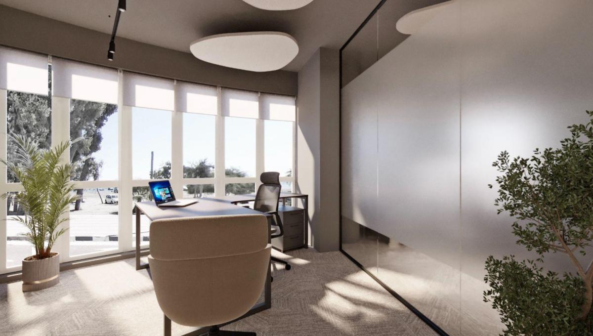 The design project was developed for an office space and includes several key zones: the entrance area, workstations, meeting rooms, and common areas.