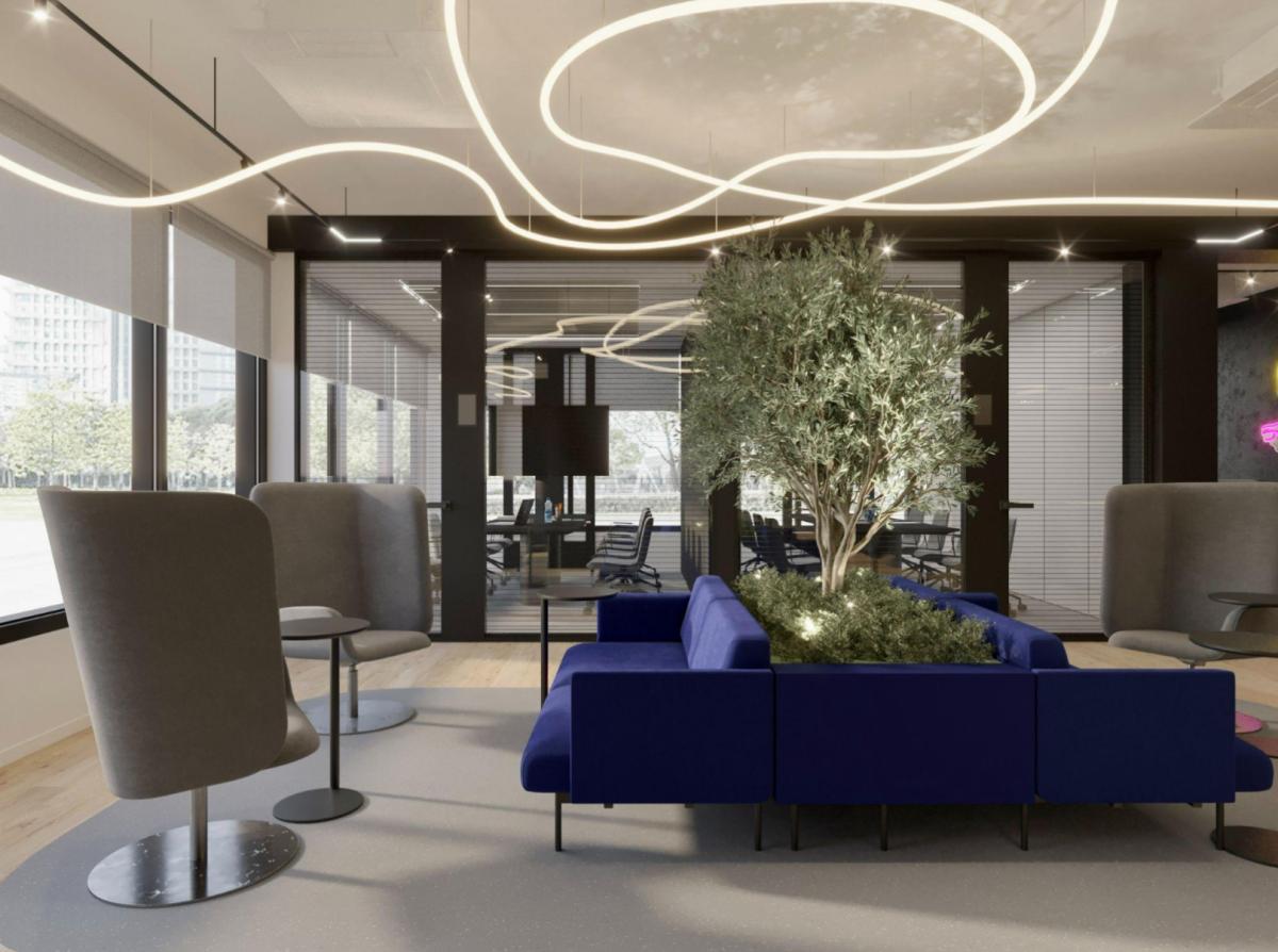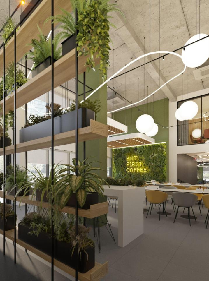 The space includes an open space area, meeting rooms, coffee points, and dedicated work zones.