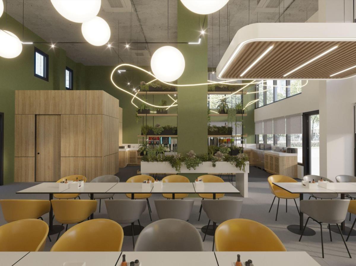 A vibrant and functional office space with a focus on a shared area for employees.