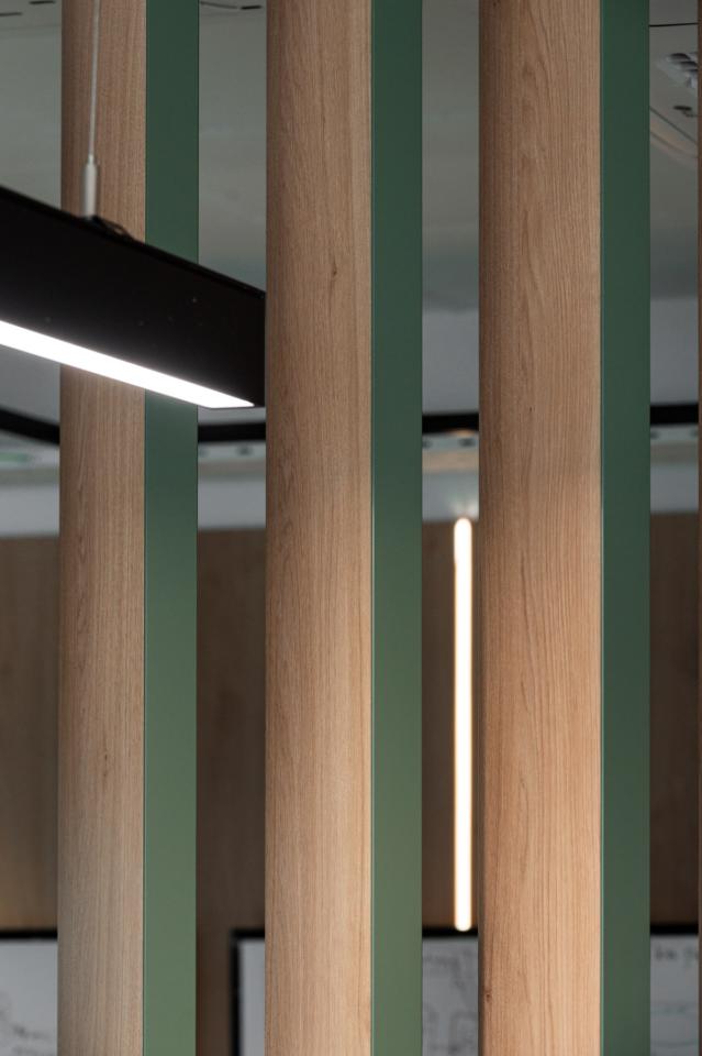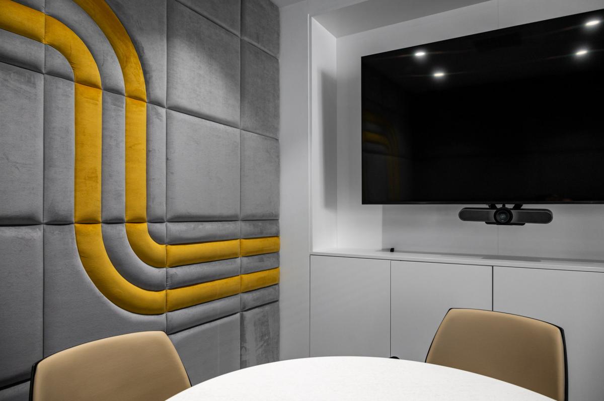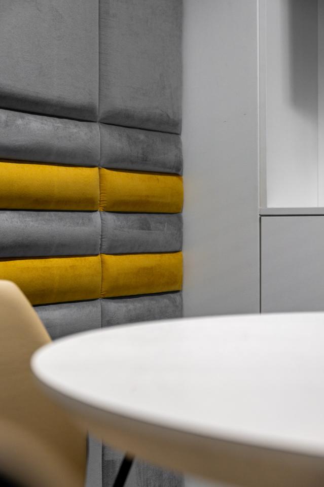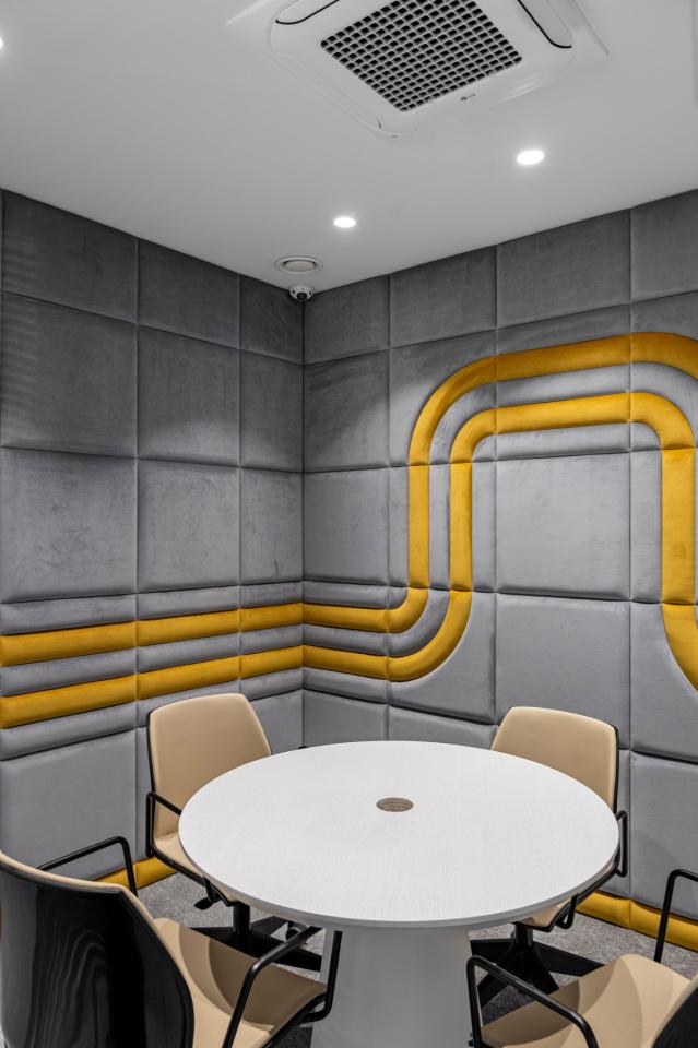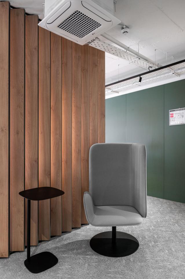 The project features LDSP panels, soft acoustic surfaces, bold wall colors, and a carefully curated material palette — all aimed at creating a balanced environment for work, rest, and informal communication.