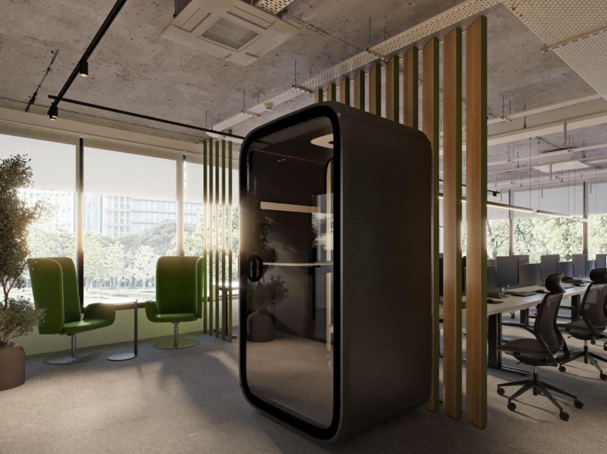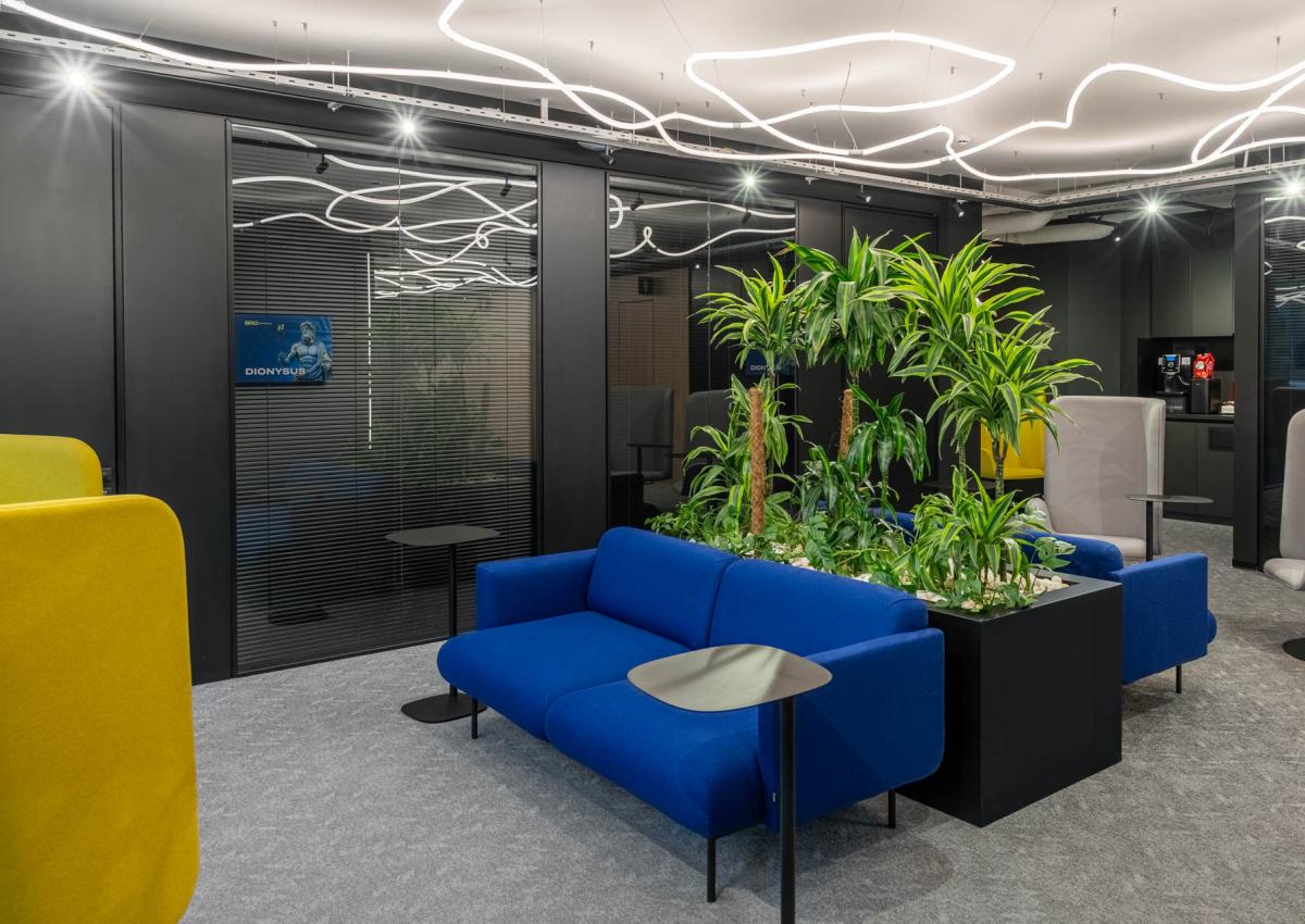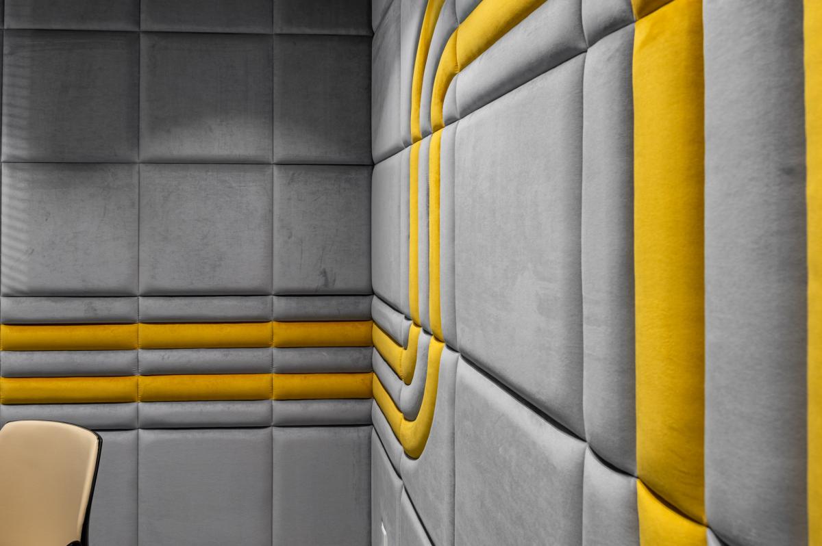 The project features LDSP panels, soft acoustic surfaces, bold wall colors, and a carefully curated material palette — all aimed at creating a balanced environment for work, rest, and informal communication.