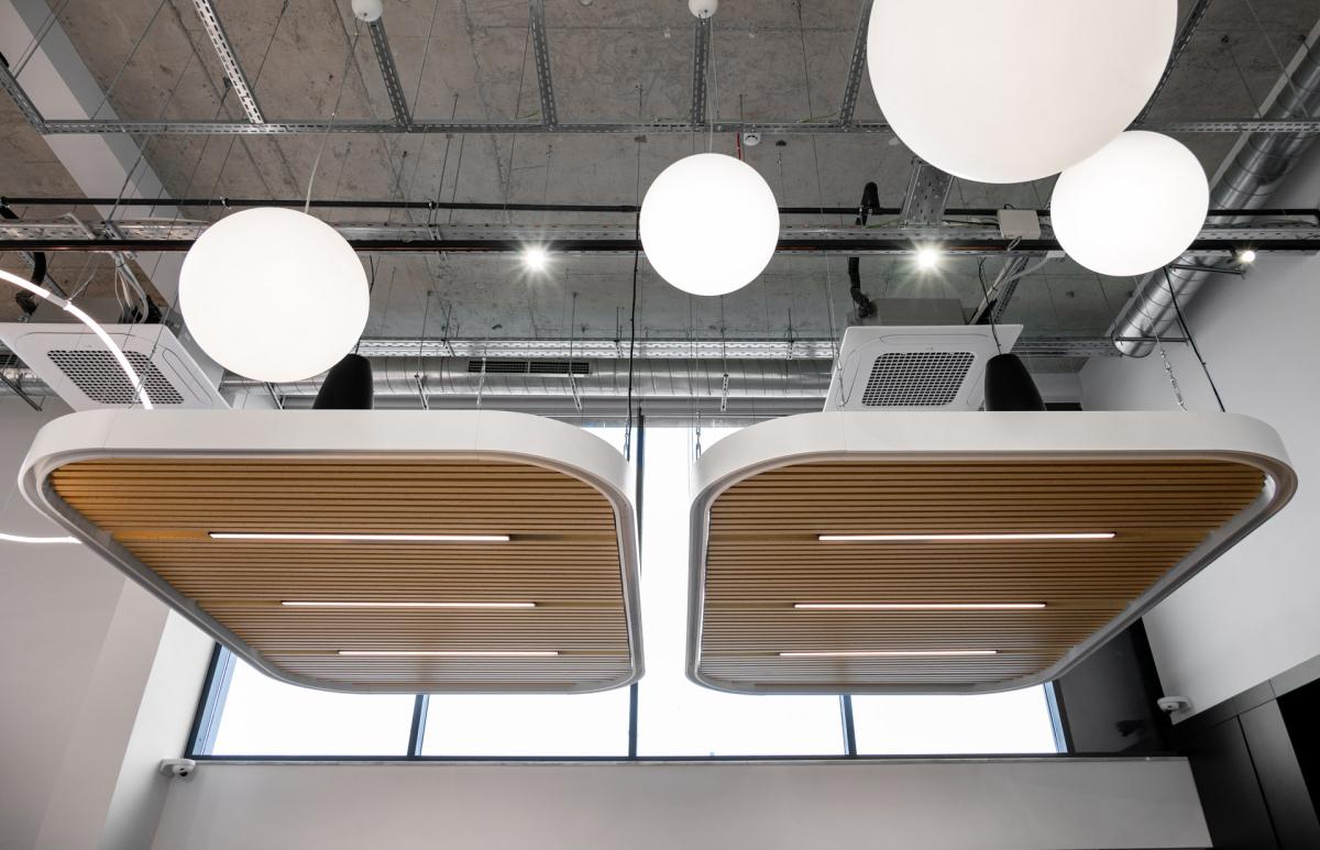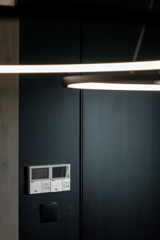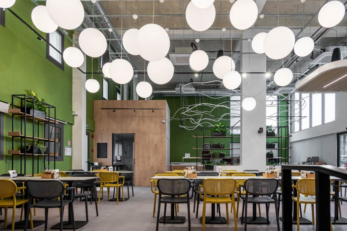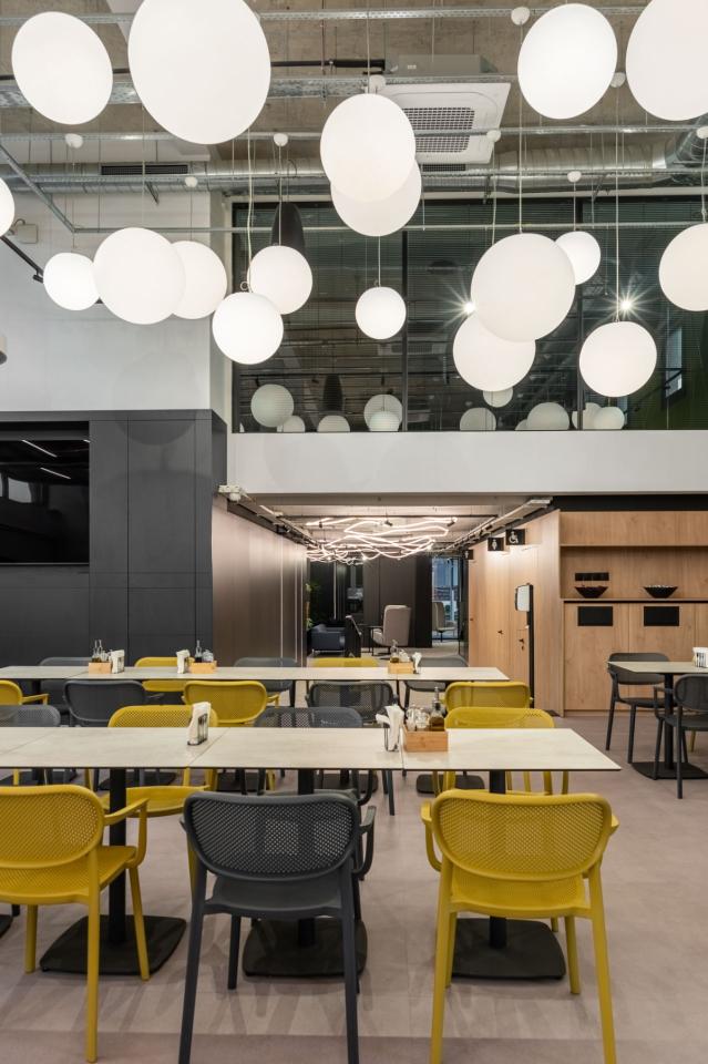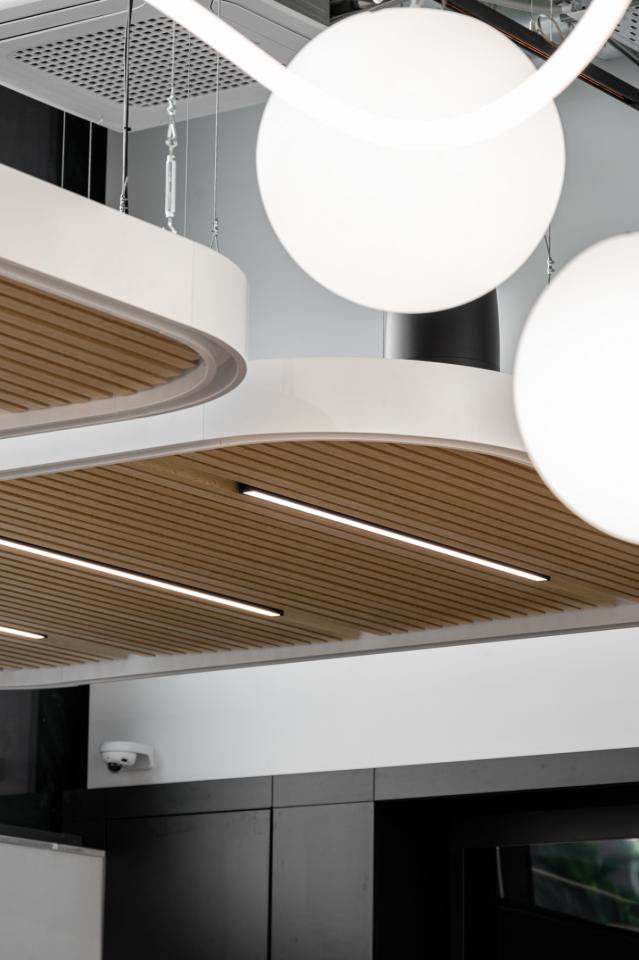 At the heart of the space is a spacious dining area with a visual focal point: a lighting installation made of flexible LED strips combined with suspended spherical fixtures, emphasizing the dynamic character of the interior.