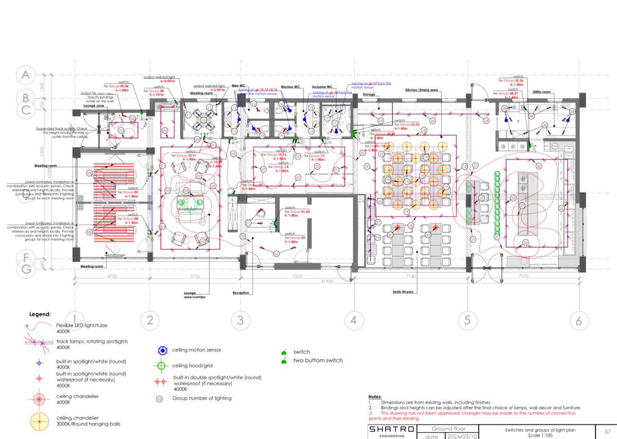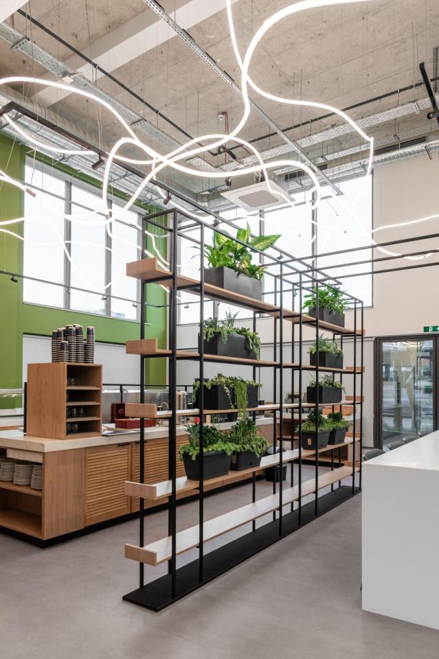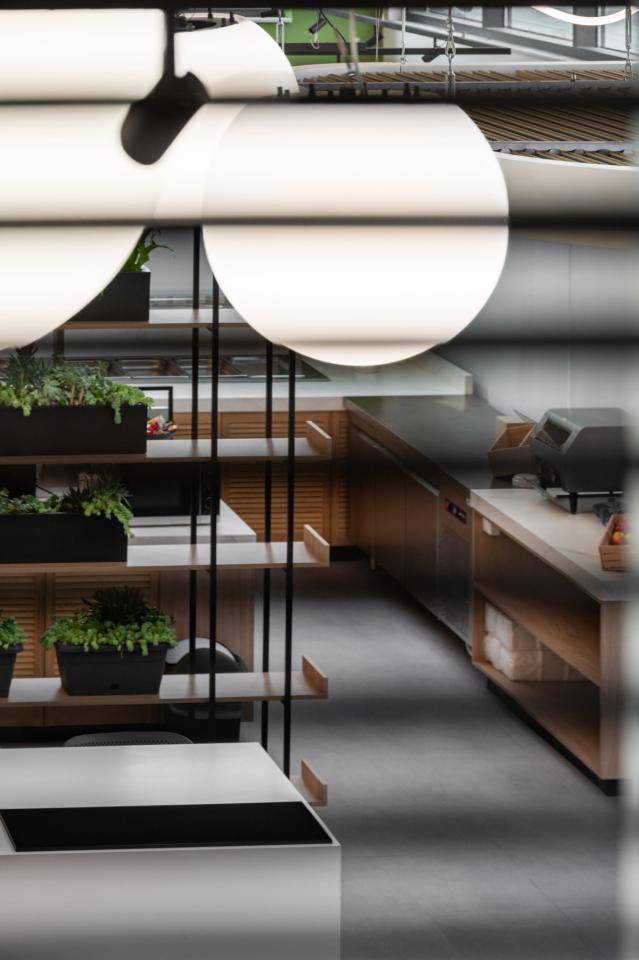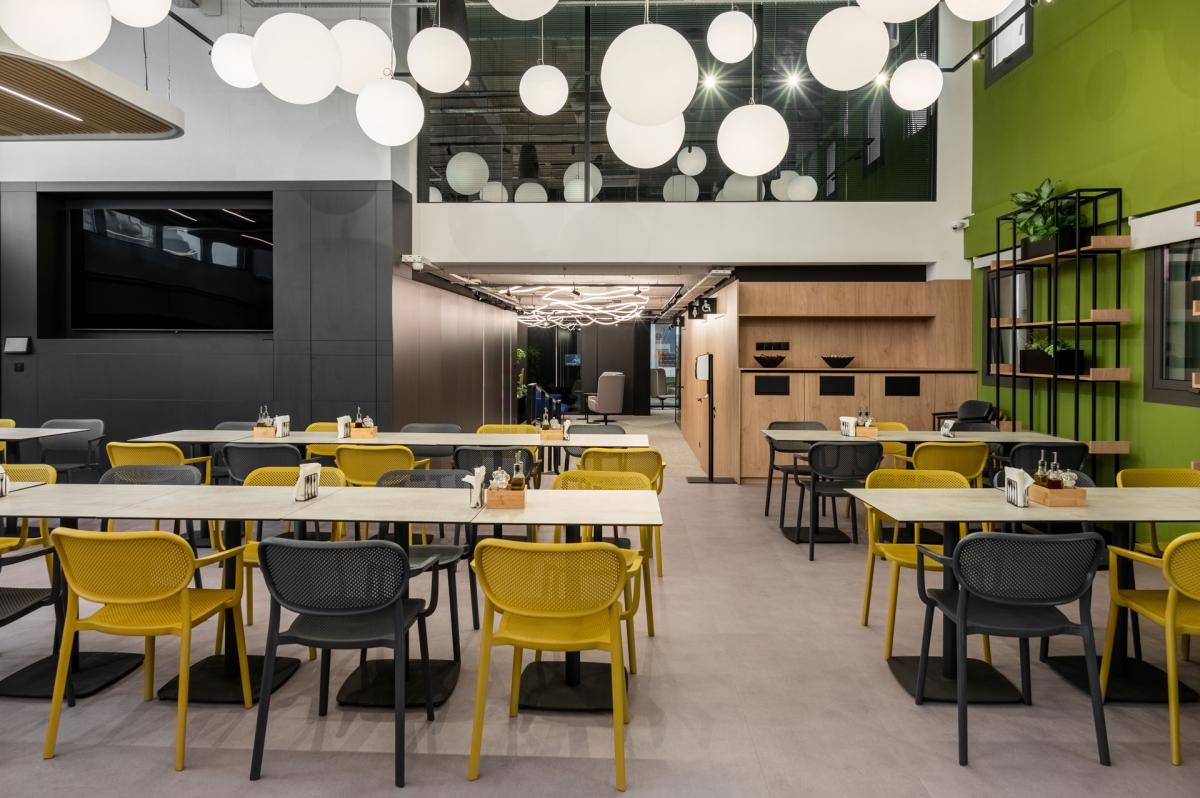 At the heart of the space is a spacious dining area with a visual focal point: a lighting installation made of flexible LED strips combined with suspended spherical fixtures, emphasizing the dynamic character of the interior.