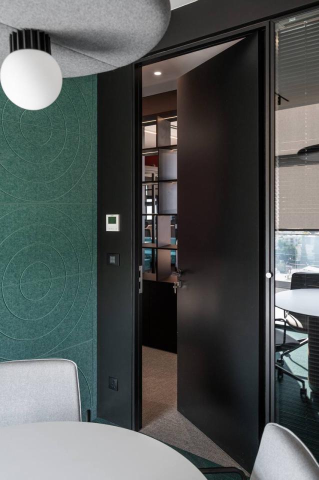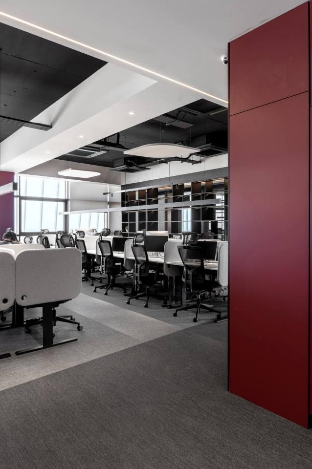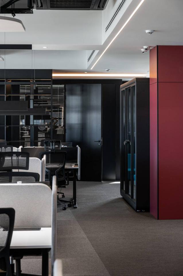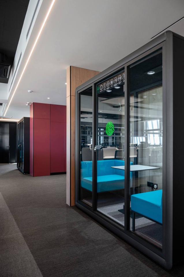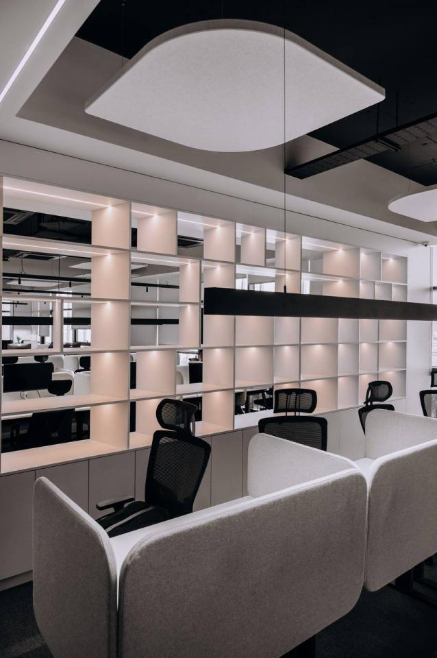 The project includes employee offices, meeting rooms, executive offices, mini-kitchens, and coffee areas. Acoustic booths for calls and online meetings are also provided.
