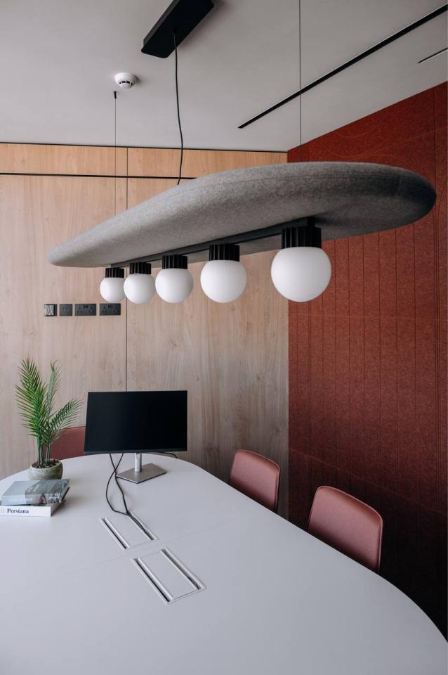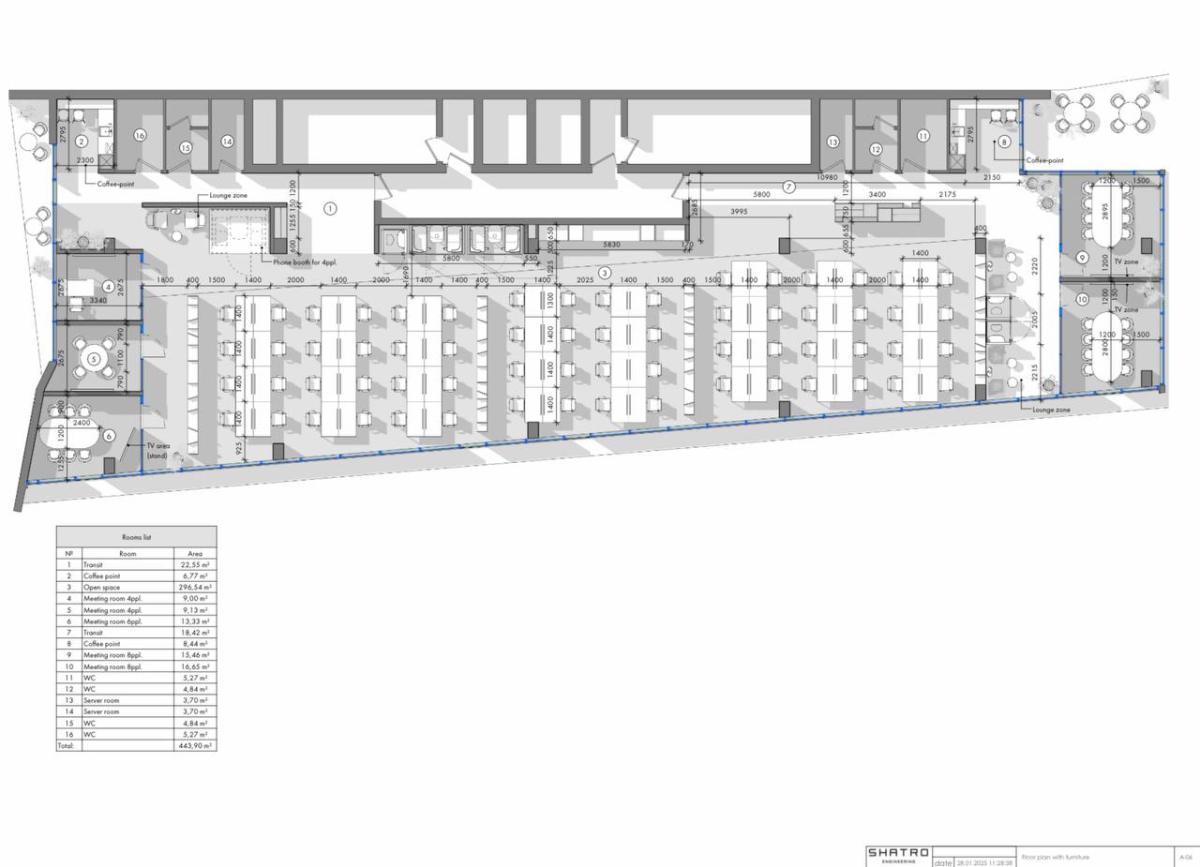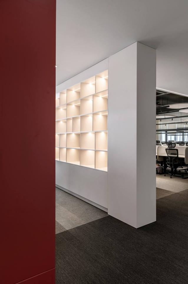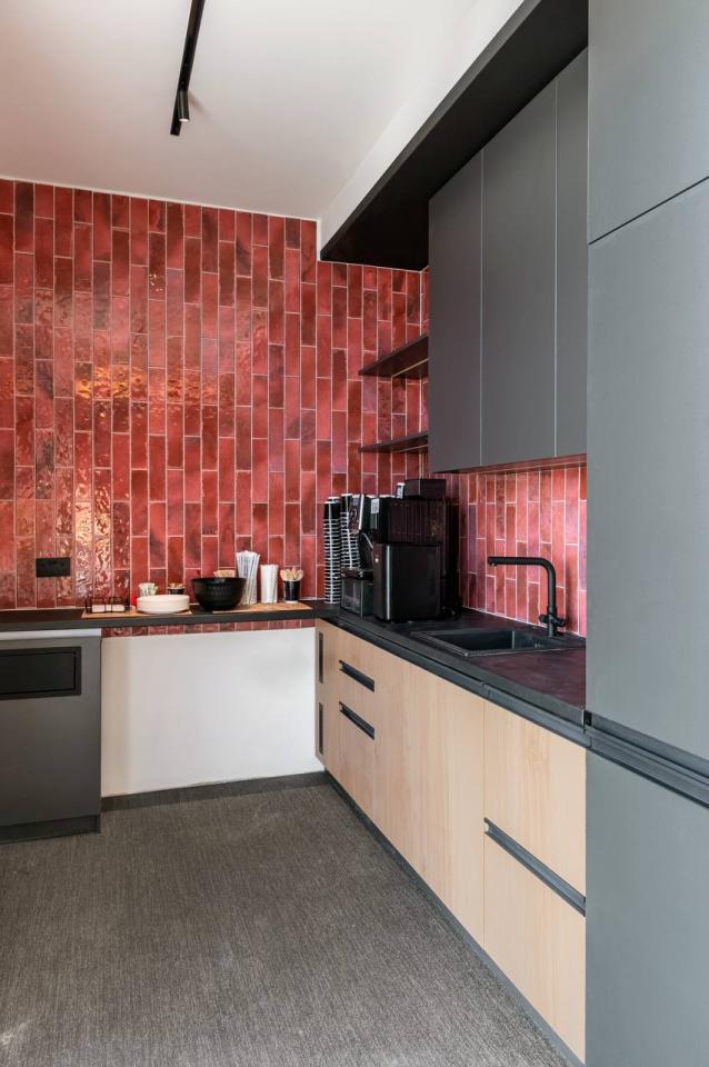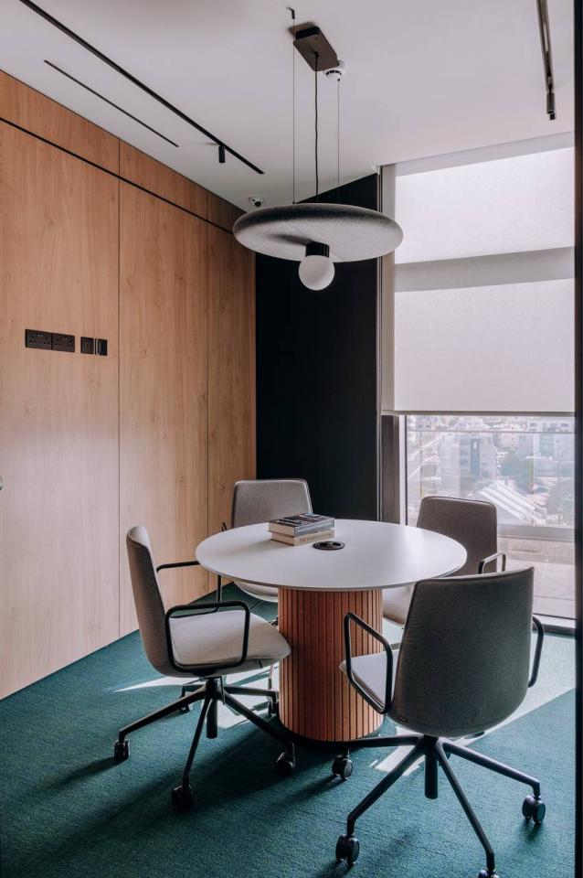 The project includes employee offices, meeting rooms, executive offices, mini-kitchens, and coffee areas. Acoustic booths for calls and online meetings are also provided.
