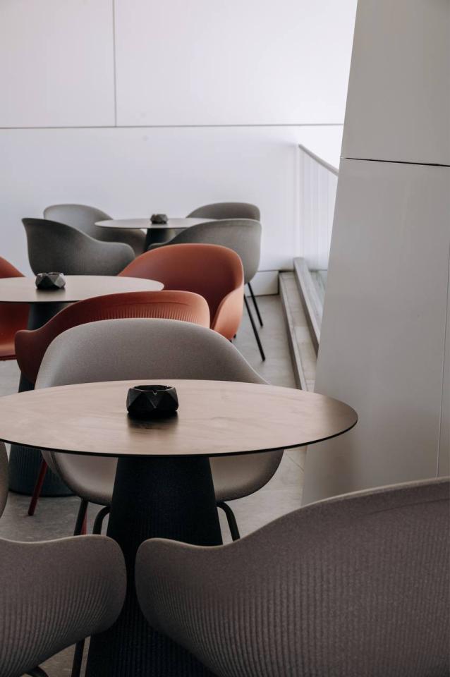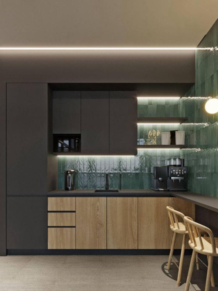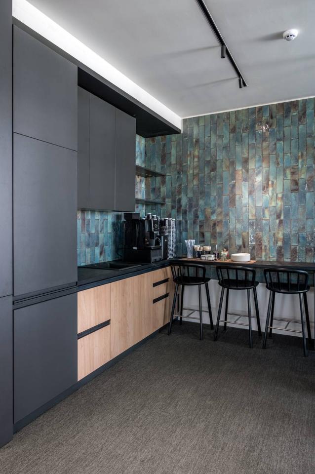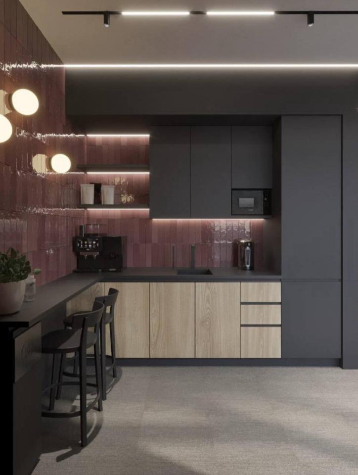 The interior incorporates natural materials—wood, concrete, and glass—combined with bright color accents and contrasting elements. Thoughtful zoning, decorative lighting, and a rich palette create an energetic and modern working environment.