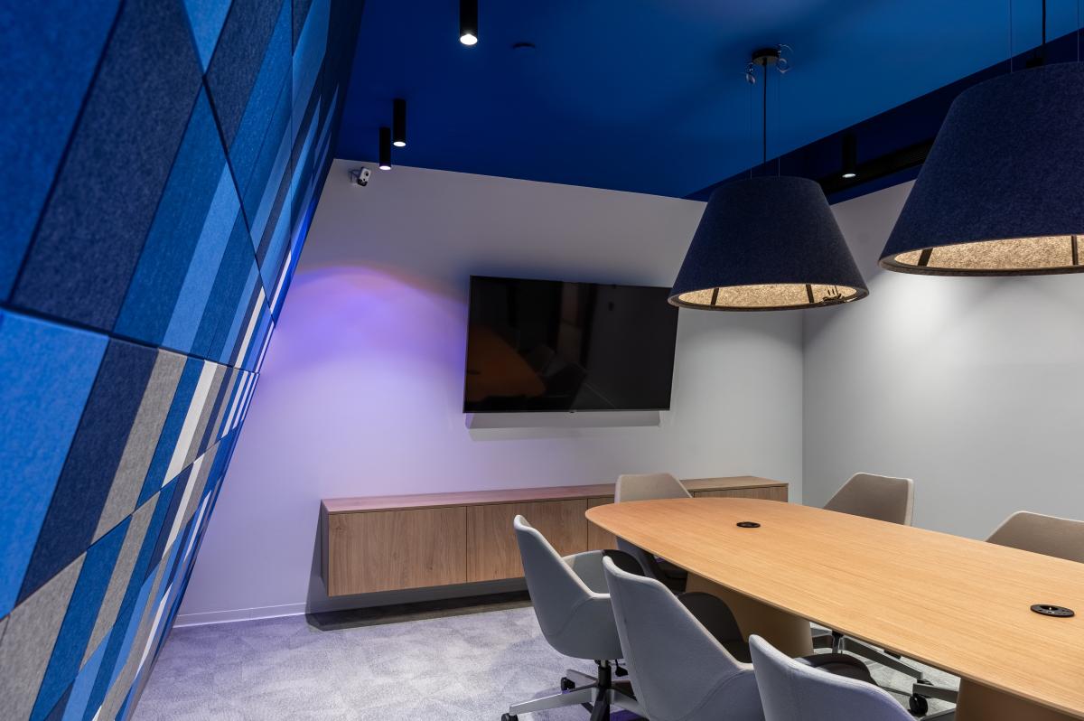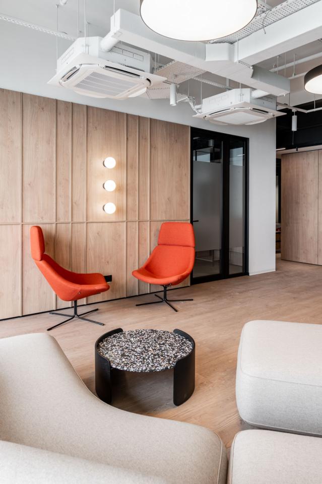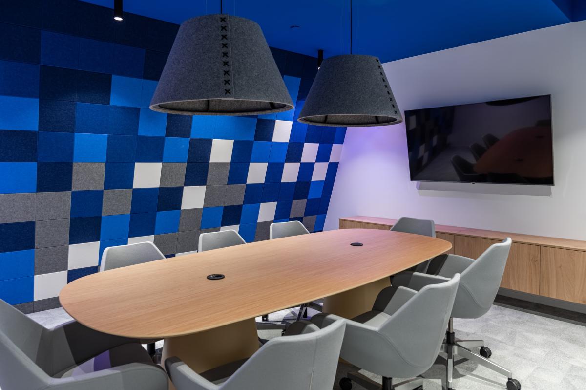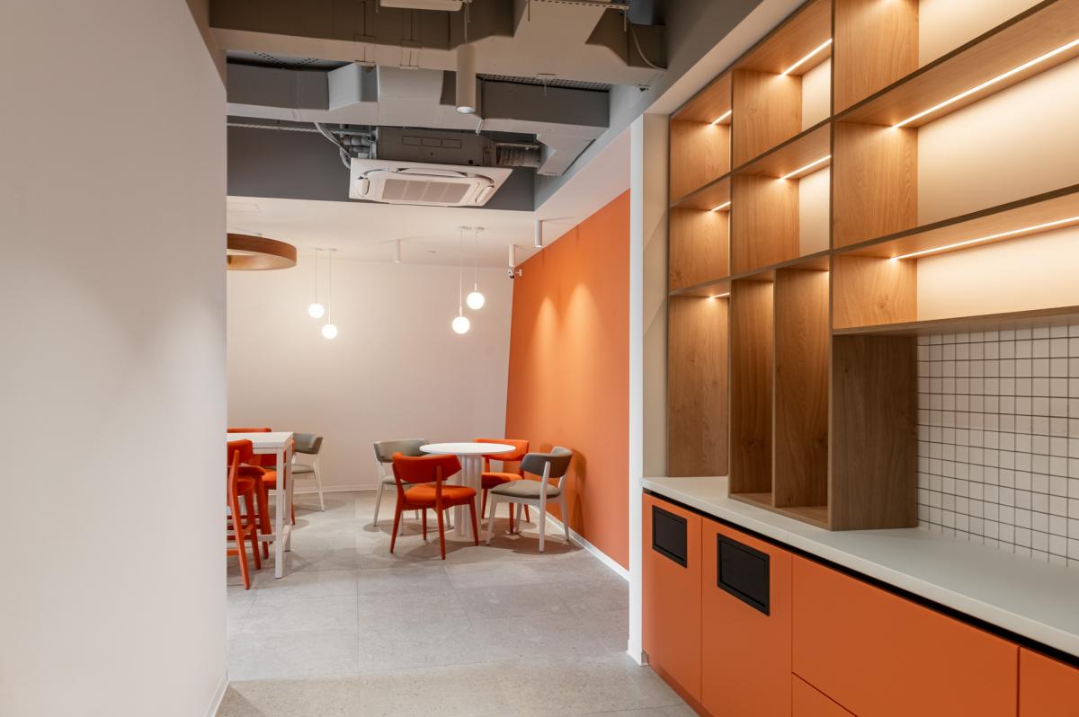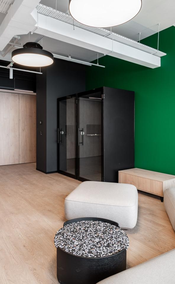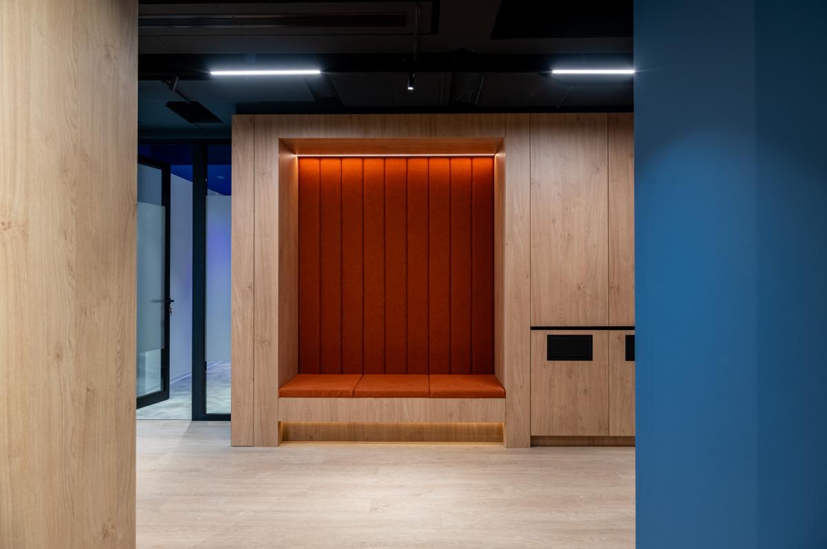 The interior is built on the combination of a minimalist architectural base and rich accent solutions: deep green, terracotta, and blue. Acoustic panels, decorative niches, ceiling structures, and custom-made built-in furniture—designed specifically for the team’s needs—were applied throughout.