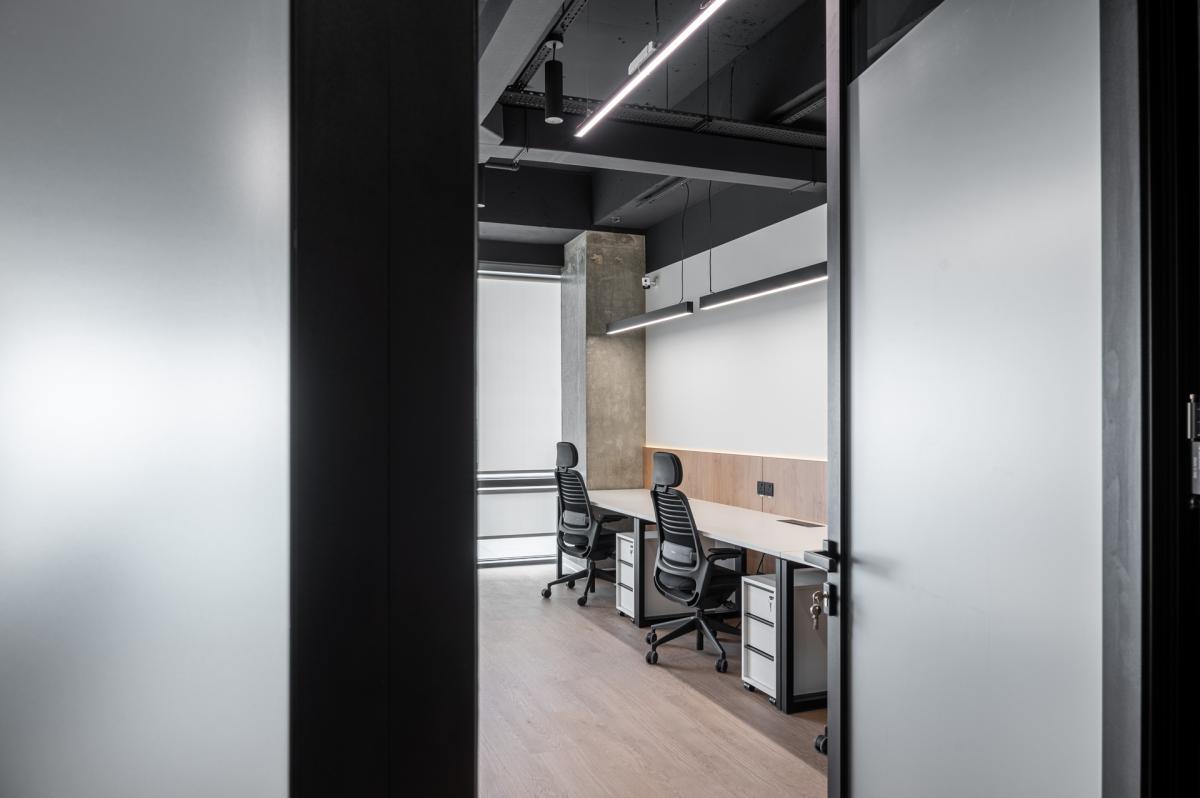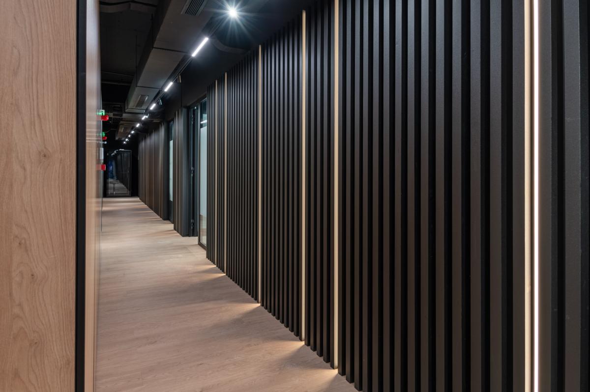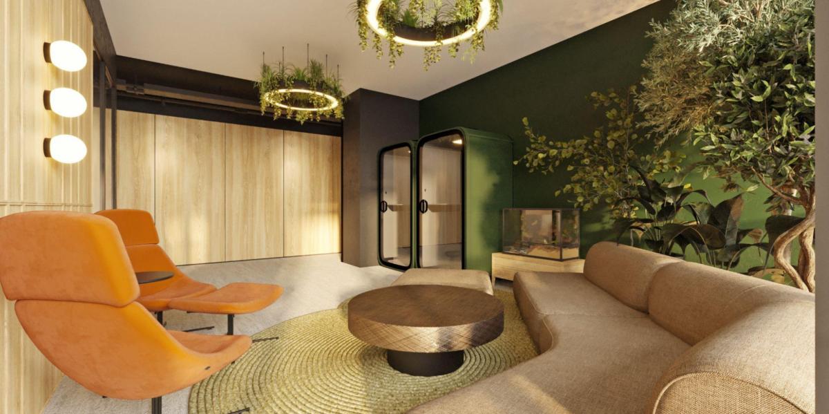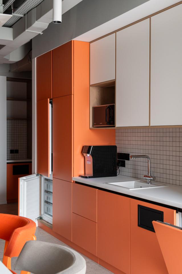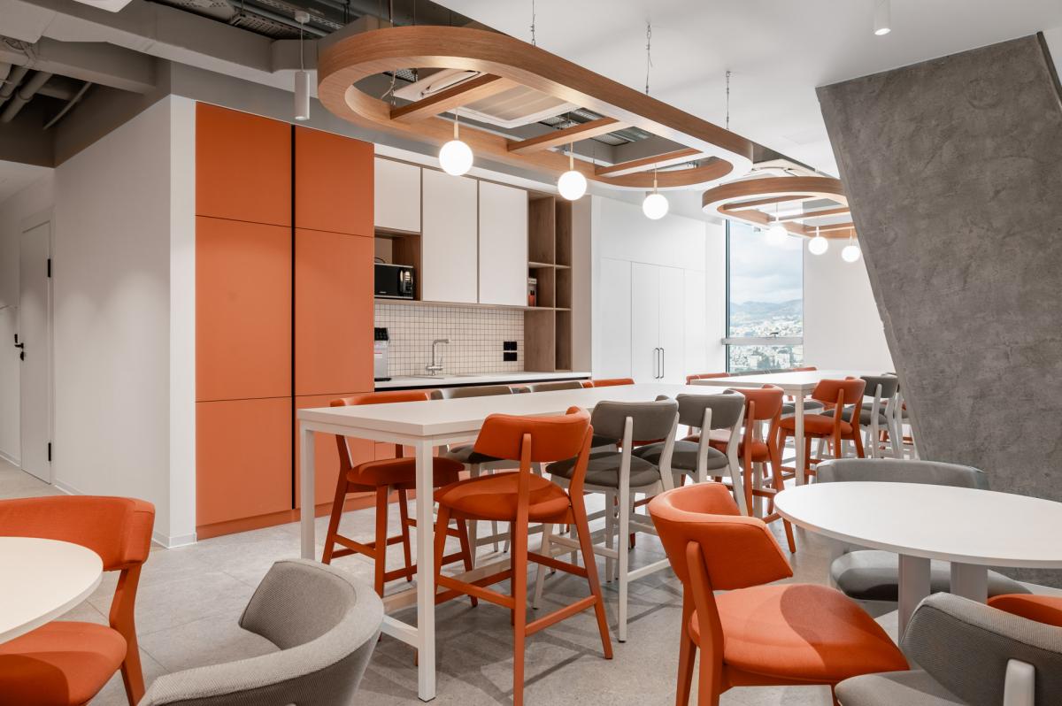 The interior is built on the combination of a minimalist architectural base and rich accent solutions: deep green, terracotta, and blue. Acoustic panels, decorative niches, ceiling structures, and custom-made built-in furniture—designed specifically for the team’s needs—were applied throughout.