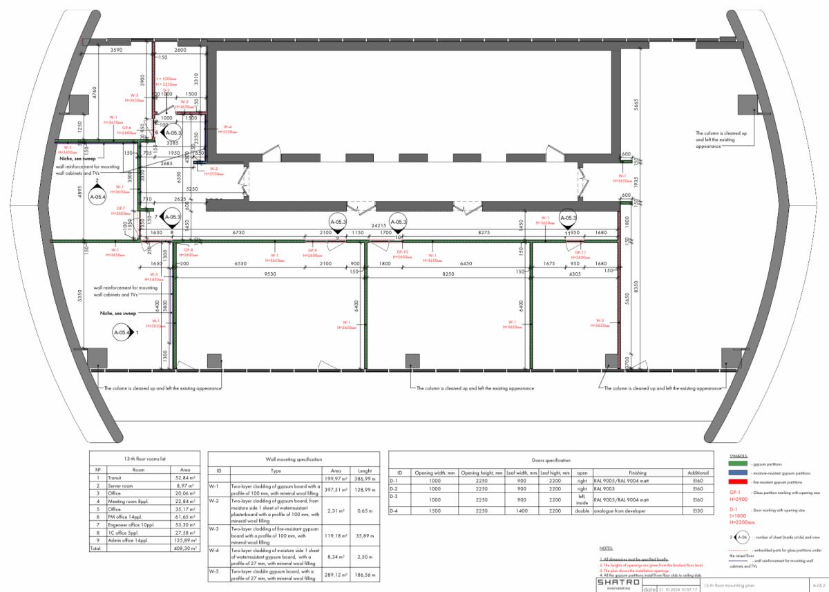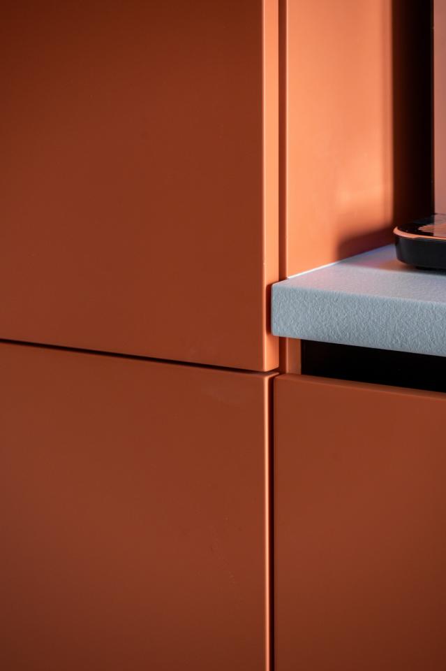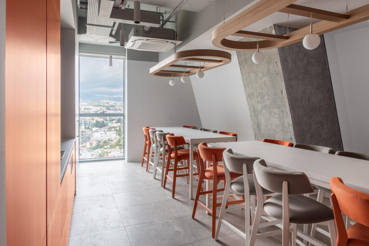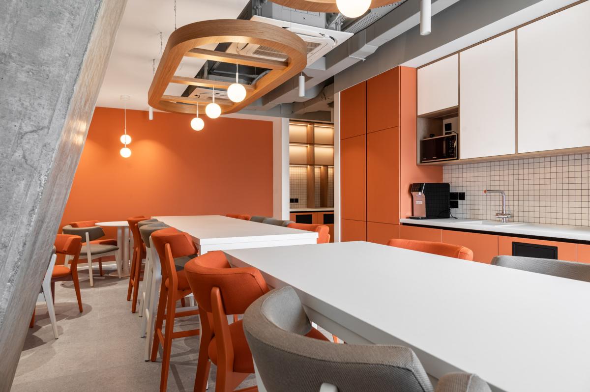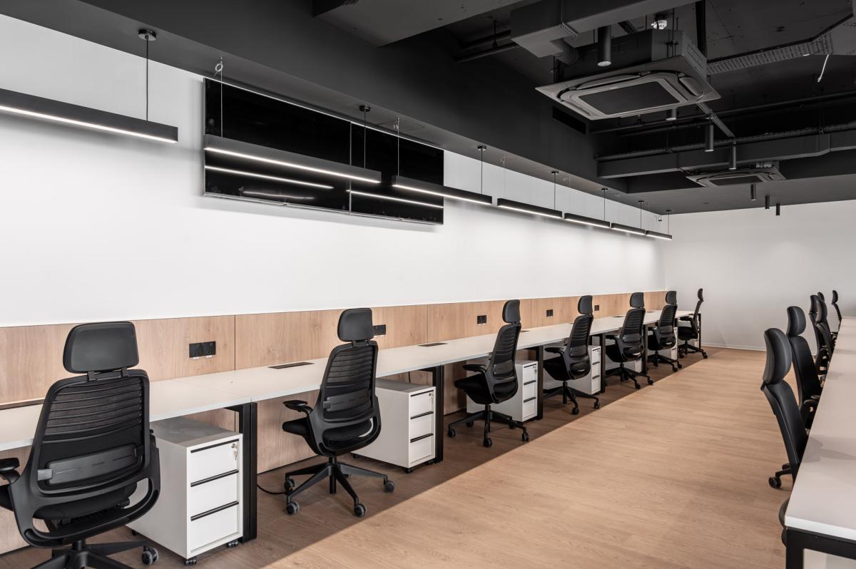 The interior is built on the combination of a minimalist architectural base and rich accent solutions: deep green, terracotta, and blue. Acoustic panels, decorative niches, ceiling structures, and custom-made built-in furniture—designed specifically for the team’s needs—were applied throughout.