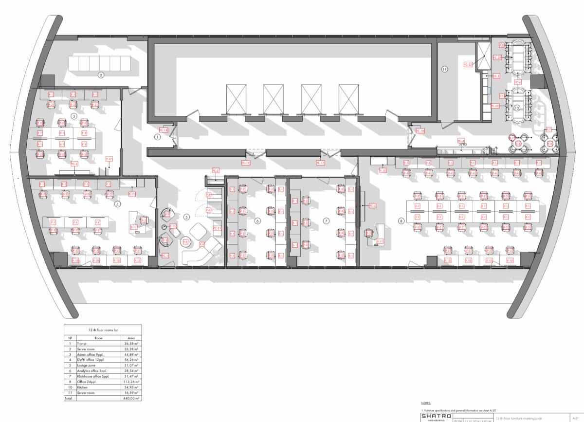 The space includes an open space area, private offices, meeting rooms, kitchens, relaxation zones, and private call pods.