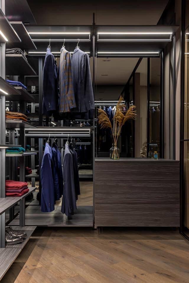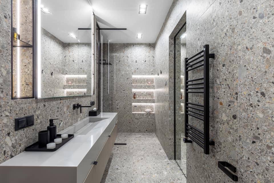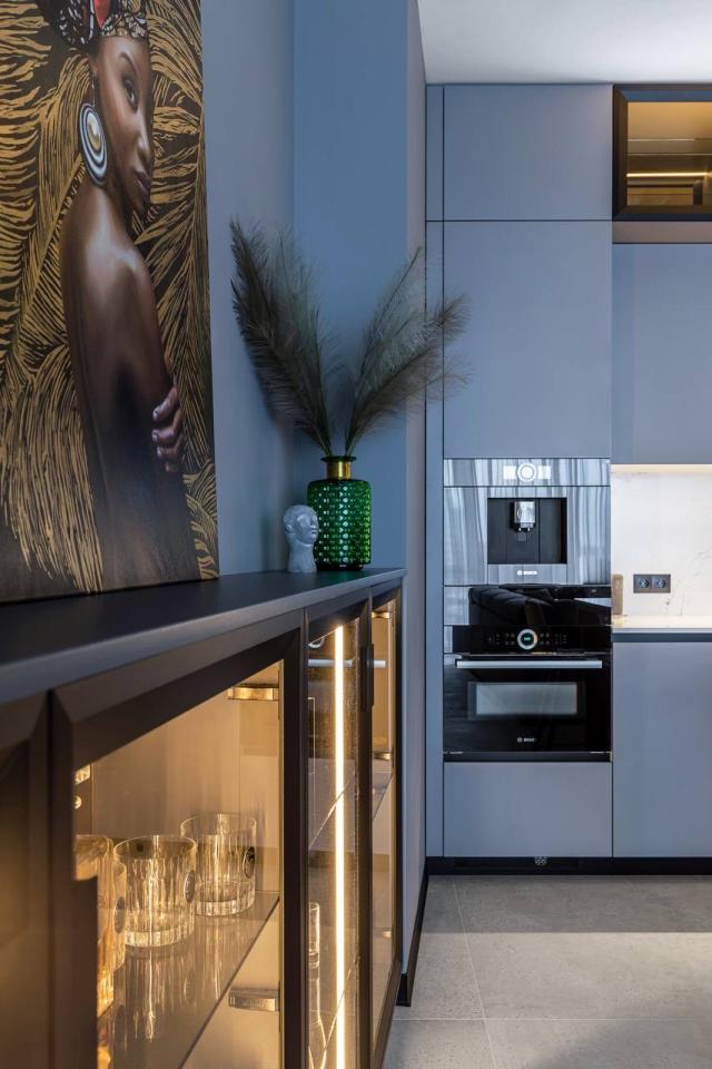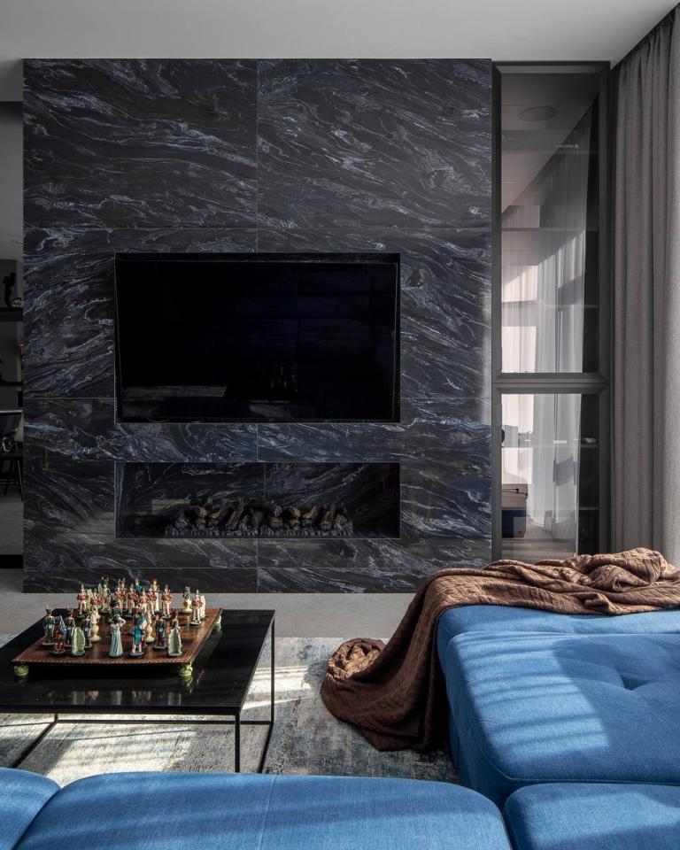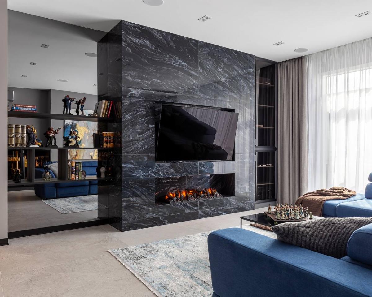 The interior is built on a combination of deep tones, stone cladding around the fireplace, integrated display cabinets, and refined lighting. The kitchen area is designed in a calm light palette, while the bathrooms feature terrazzo finishes with built-in niches and subtle lighting lines.