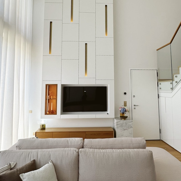 A key task was working with the living room space featuring ceiling heights of up to 6 meters. We designed and built a gypsum board construction with integrated lighting that highlights the architecture and creates a soft, diffused evening glow.
