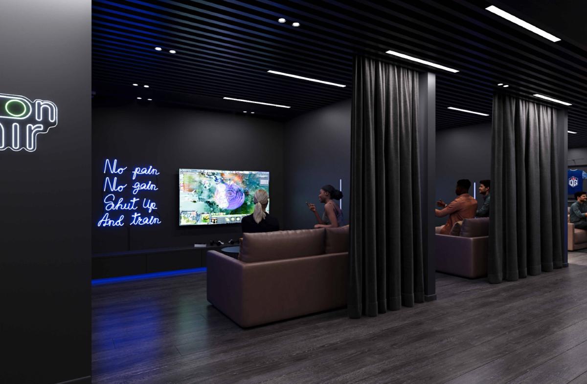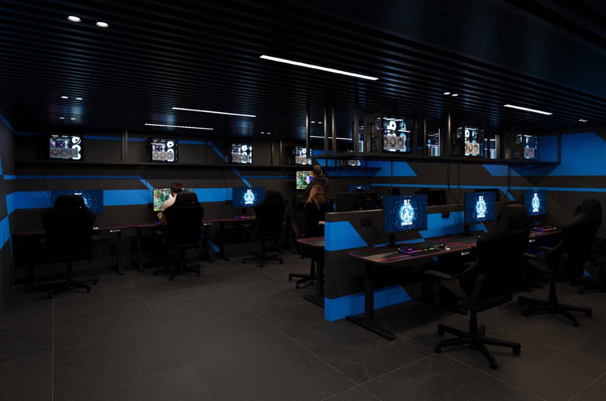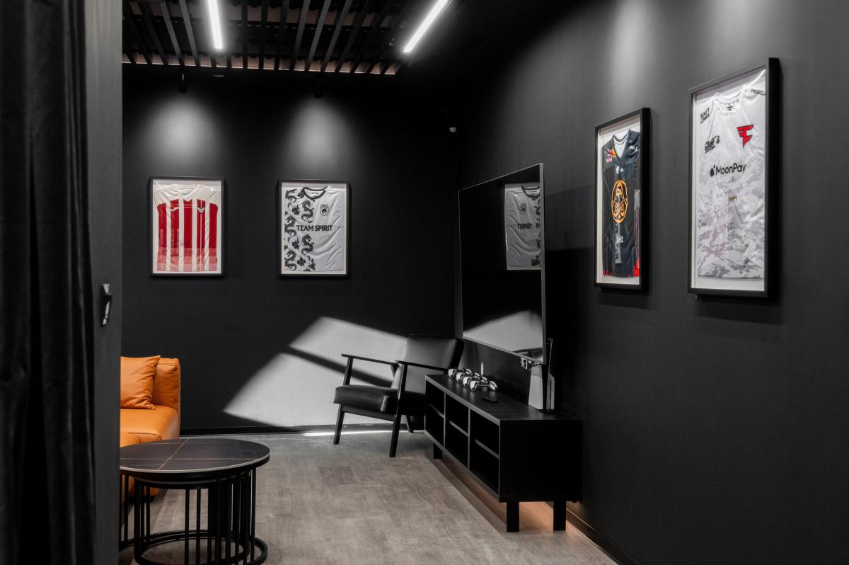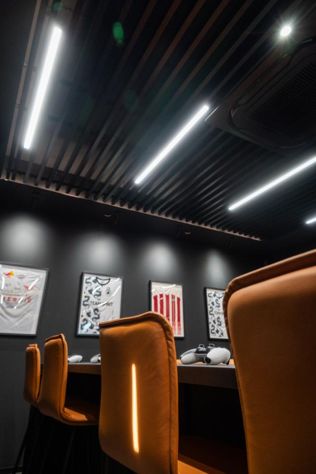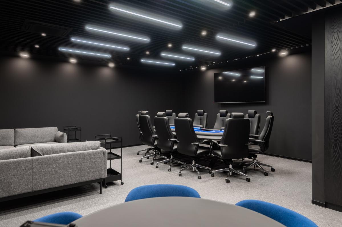 The interior is built on strong visual contrast: a fully dark palette, focused lighting, and vibrant neon elements. The space includes several functional zones — gaming stations, a lounge area, and a separate tournament room with a poker table.
