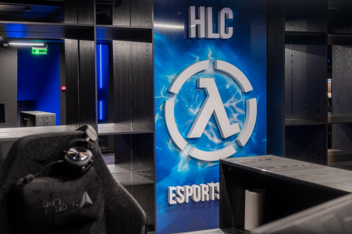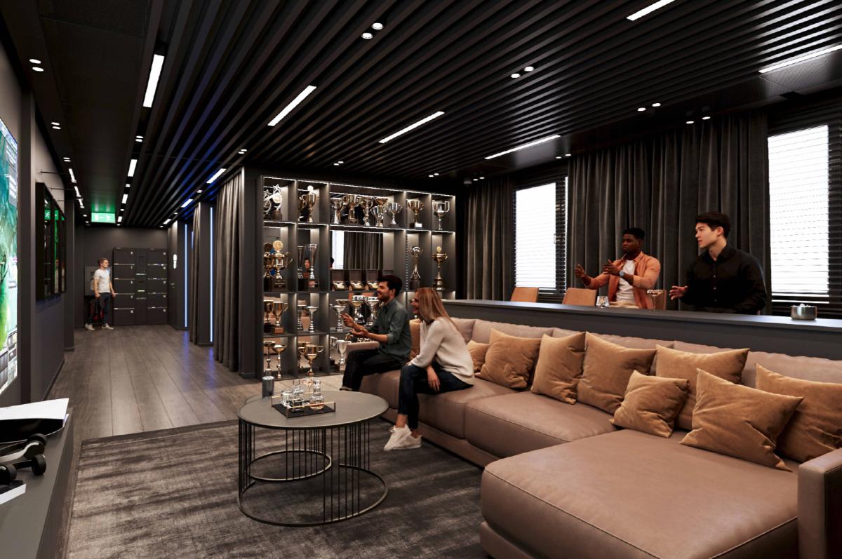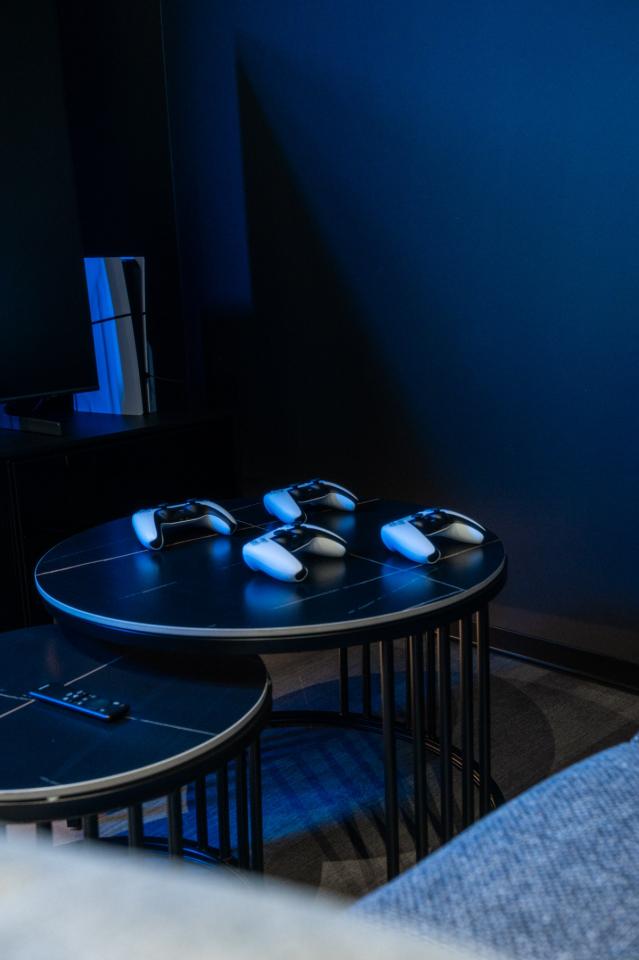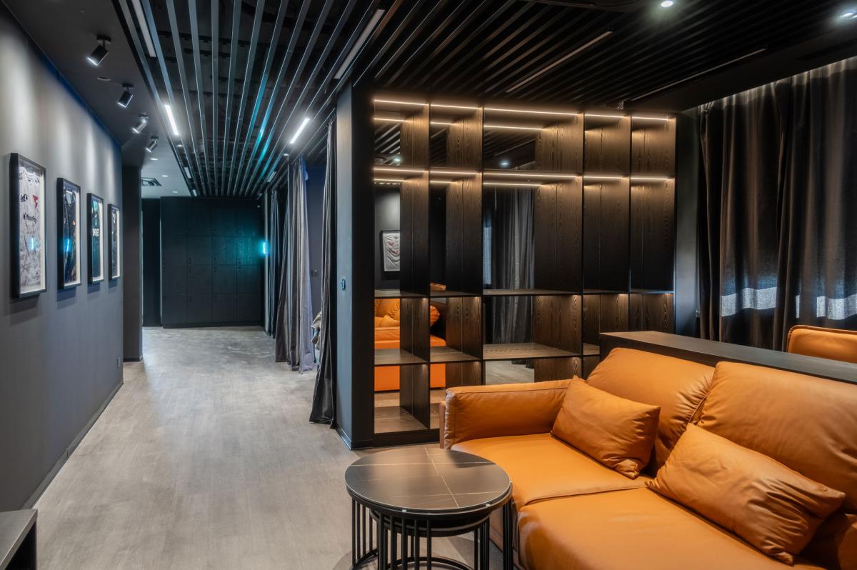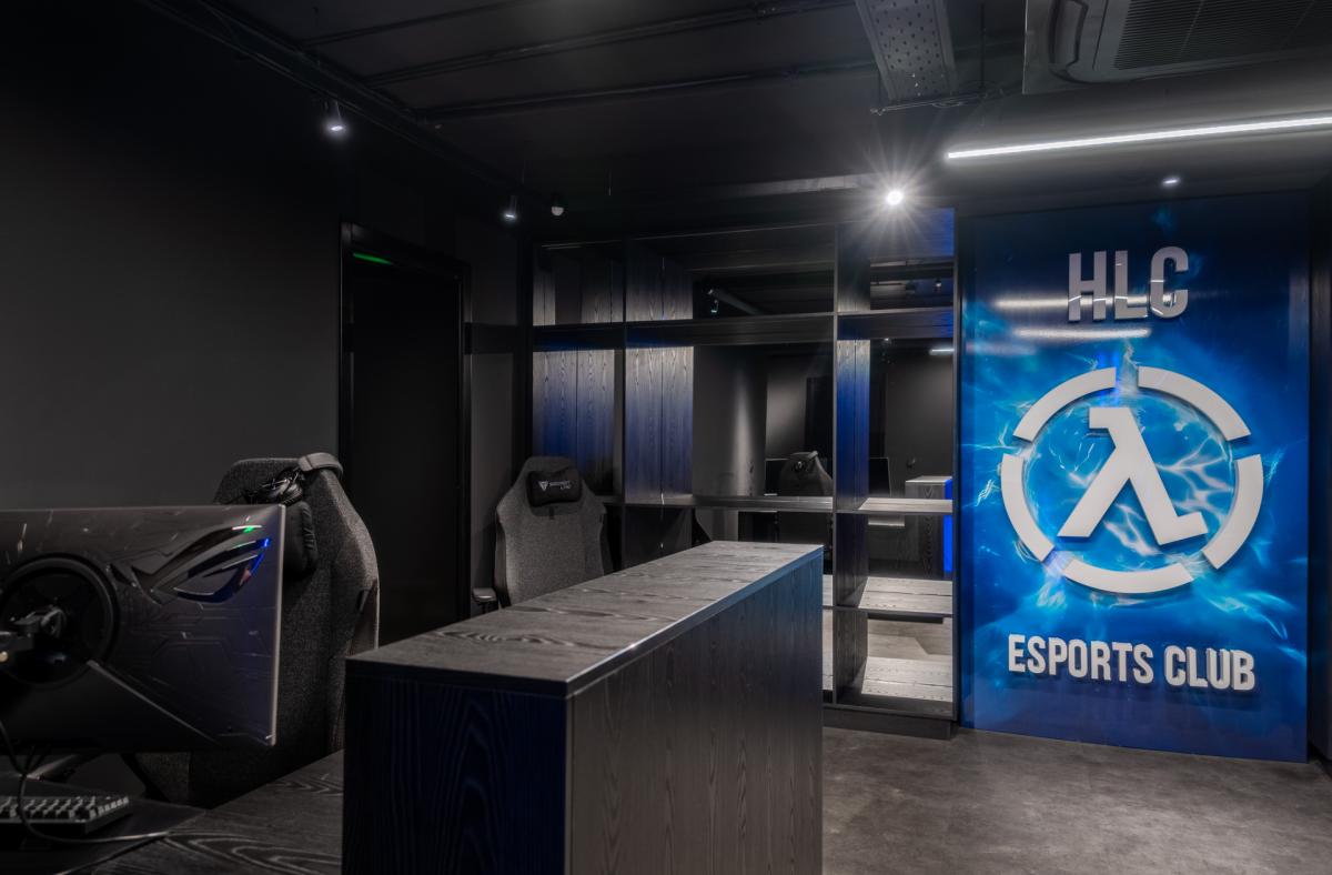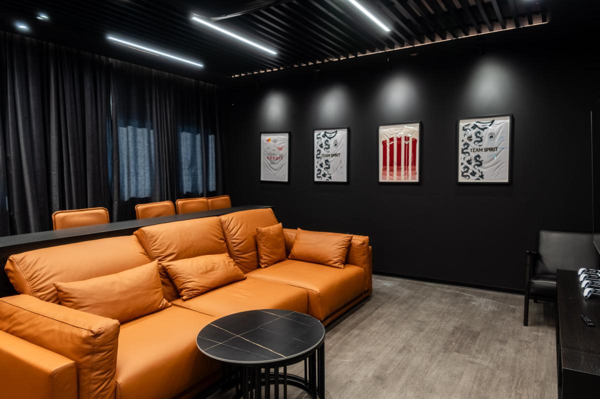 The interior is built on strong visual contrast: a fully dark palette, focused lighting, and vibrant neon elements. The space includes several functional zones — gaming stations, a lounge area, and a separate tournament room with a poker table.